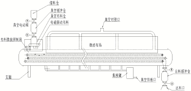為物料的連續(xù)進(jìn)出,采用雙級真空擋板閥裝置。該裝置由進(jìn)料斗、緩沖倉、上真空擋板閥、暫存?zhèn)}、下真空擋板閥、接口等部分組成。同時(shí),在進(jìn)料端輔以電磁布料裝置,使物料均勻分布于傳送帶上。其動(dòng)作過程為,初始狀態(tài)上、下真空擋板閥均閉合,物料經(jīng)進(jìn)料斗進(jìn)入緩沖倉,達(dá)到一定質(zhì)量后,上真空擋板閥首先打開,物料進(jìn)入緩沖倉,然后上真空擋板閥關(guān)閉,下真空擋板閥打開,物料經(jīng)接口進(jìn)入設(shè)備內(nèi)部,下真空擋板閥關(guān)閉,完成一動(dòng)作循環(huán),準(zhǔn)備進(jìn)入下一循環(huán)。輔助的布料裝置,了間隙時(shí)間內(nèi),物料的連續(xù)性。真空擋板閥采用電動(dòng)控制,同時(shí)擋板上嵌有食品級硅橡膠密封材料用以真空密封,接口處有導(dǎo)電材料密封微波。